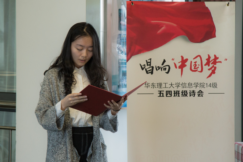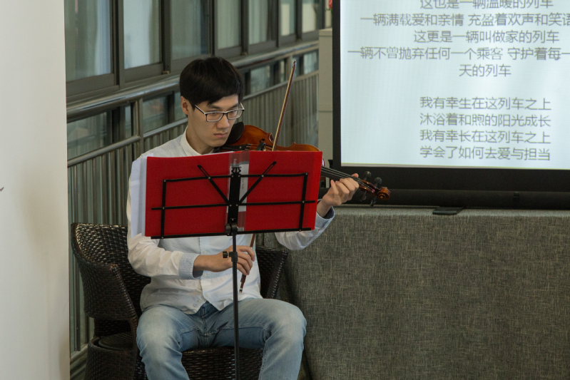 诗会从员工蔡福全的谱曲诗歌《梅陇路上,长大了》作为序章,勾起了员工们追忆旧日、展望未来的诗人情怀。而后,7位同学逐一吟咏自己的诗作,周德伦将祖国形容为一辆路途漫长却又向着希望的“梦想号”列车,守护的使命、驾驶的徽章祖祖辈辈地流传着;孙浩眼里的山河氤氲成了一个锦绣的梦,我们青年宛如青鸟徜徉在瑰丽的中国梦中;王子晨面对着华夏大地,说有梦想三寻,期待着中华能披襟斩棘、巨龙腾飞;王喆琪和陈歒阳眼中的中国梦有着绚丽的色彩、多元的价值;房天顺歌颂少年意气,英姿勃发;韦钦臣立誓“待少年郎,勤学习,丰思想,定傲看寰宇圆梦中国”。在同学们抒怀胸臆、朗诵解读之时,张晨曦的小提琴伴奏和顾庞的书法展示更为诗会增添了一抹亮色和文化底蕴。