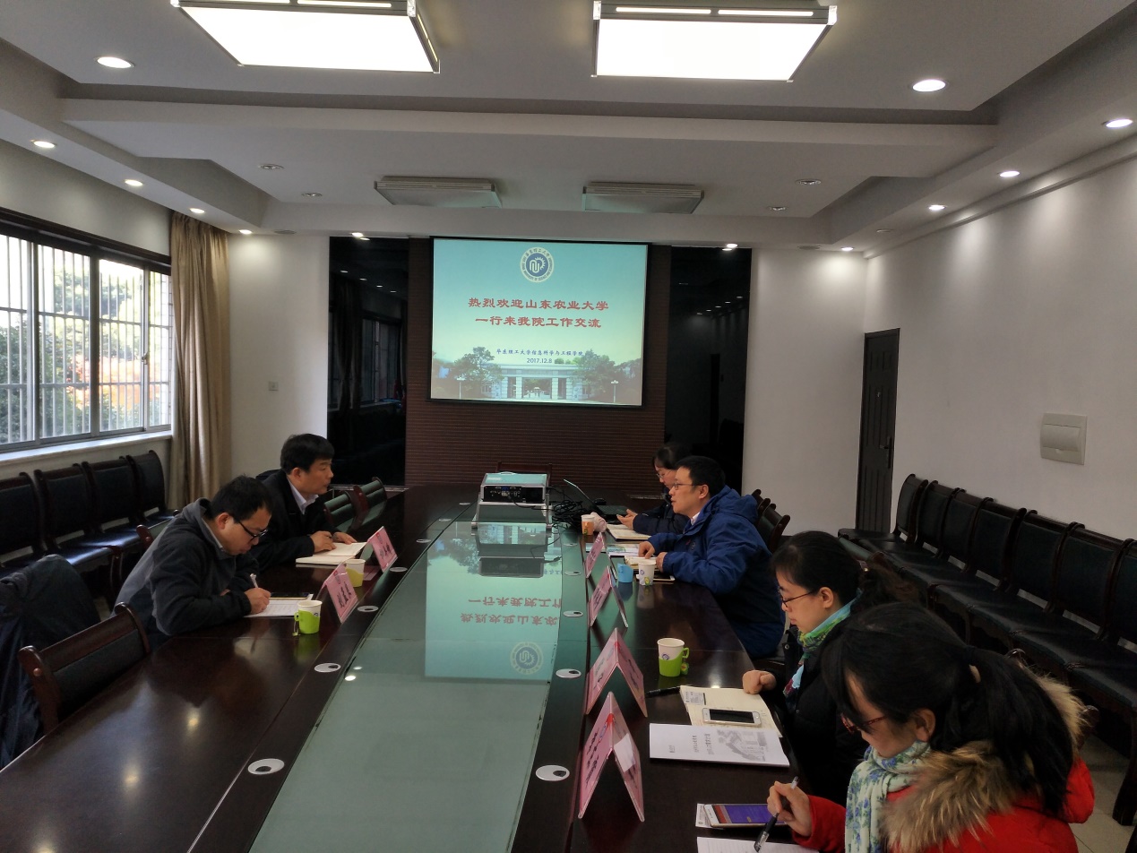 12月10日,山东农业大学太阳成集团tyc122cc副经理柳平增、信息与计算科学系副主任刘孟良一行来太阳成集团tyc122cc进行调研交流。太阳成集团tyc122cc副经理钟伟民、万永菁,经理助理兼电信系系主任陈宁,计算机系副主任李建华,研究生辅导员李东霞等参加交流会。