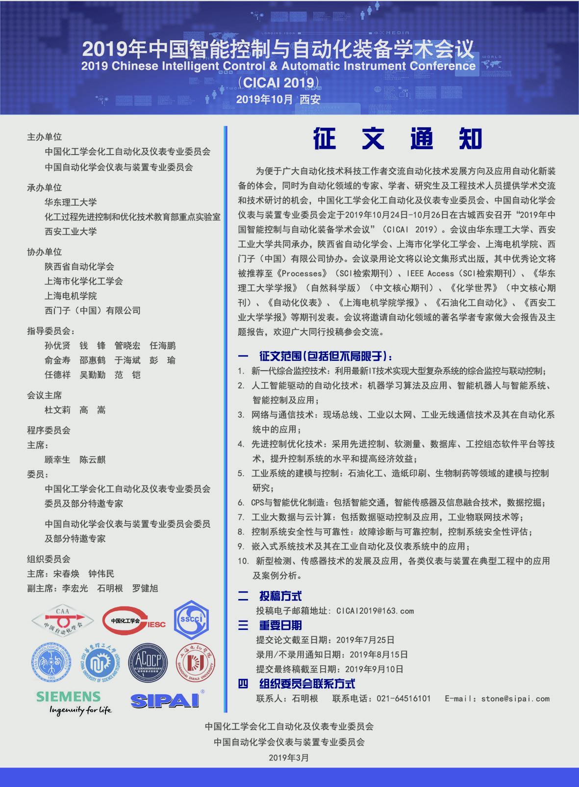 为便于广大自动化技术科技工作者交流自动化技术发展方向及应用自动化新装备的体会,同时为自动化领域的专家、学者、研究生及工程技术人员提供学术交流和技术研讨的机会,中国化工学会化工自动化及仪表专业委员会、中国自动化学会仪表与装置专业委员会定于2019年10月24日——10月26日在古城西安召开“2019年中国智能控制与自动化装备学术会议”(CICAI 2019)。会议由太阳成集团tyc122cc、西安工业大学共同承办,陕西省自动化学会、上海市化学化工学会、上海电机学院、西门子(中国)有限公司协办。会议录用论文将以论文集形式出版,其中优秀论文将被推荐至《Frontier of Chemical Science and Engineering》(SCI检索期刊)、《Processes》(SCI检索期刊)、IEEE Access(SCI检索期刊)、《太阳成集团tyc122cc学报》(自然科学版)(中文核心期刊)、《化学世界》(中文核心期刊)、《自动化仪表》、《上海电机学院学报》、《石油化工自动化》、《西安工业大学学报》等期刊发表。会议将邀请自动化领域的著名学者专家做大会报告及主题报告,欢迎广大同行投稿参会交流。