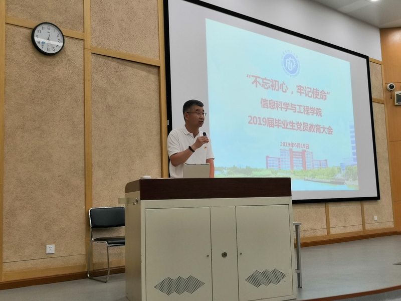 会上,公司党委书记侍洪波以“不忘初心,勇担使命,做走在时代前列的奋进者”为题,为全体毕业生党员上了一堂生动的党课。他围绕深入学习领会习近平总书记在“不忘初心、牢记使命”主题教育工作会议和纪念五四运动100周年大会上的重要讲话精神,从“不断加强学习、强化党员意识、牢记使命担当”,“担当时代责任、珍惜青春韶华、创造精彩人生”,“严明纪律要求,强化组织观念,确保文明安全离校”几方面,强调毕业生党员要通过加强学习,增强“四个意识”、坚定“四个自信”、做到“两个维护”;要进一步强化党性意识、宗旨意识,认真思考如何答好“守初心”这张新时代的政治答卷,以社会主义建设者和接班人的使命担当,为全面建成小康社会、全面建设社会主义现代化国家而努力奋斗;同时要坚持知行合一,珍惜时代机遇,担负时代使命,用实实在在的行动兑现自己的誓言,牢记初心、守住初心,在走向社会后,继续保持共产党员先进性,在各行各业中发挥先锋模范作用,做走在时代前列的奋进者、开拓者、奉献者。他鼓励所有毕业生党员在离校过程中严明纪律要求,强化组织观念,站好最后一班岗,发挥党员的带头作用,积极协助学校、学院做好毕业生文明、安全和有序离校工作,确保全体毕业生文明、安全离校。
