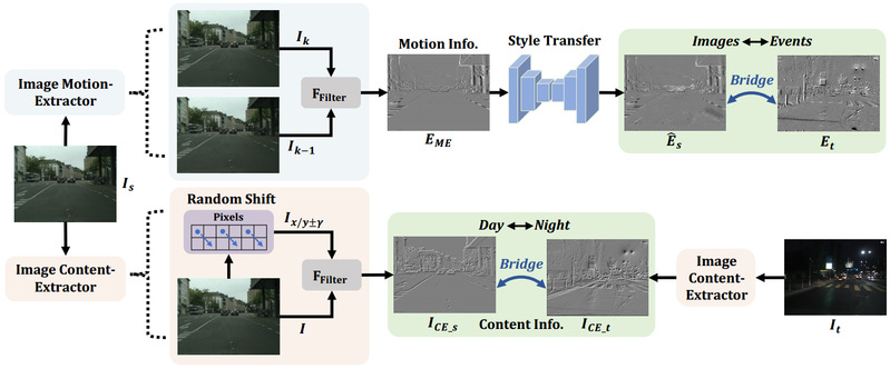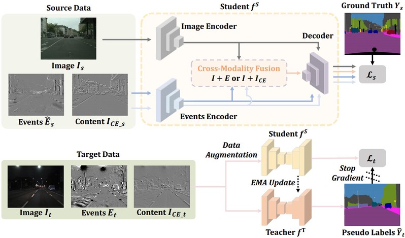 针对夜间图像质量差无法捕捉结构细节和边界信息导致语义分割性能差的问题,研究团队在“CMDA:跨模态域自适应夜晚语义分割”中创新地引入事件相机这一新型的视觉传感器,其具有高动态范围的特点,能对传统相机的不足进行补偿,提升夜间语义分割的性能。在此基础上,研究团队提出了一种新的无监督跨模态域适应(CMDA)框架,利用多模态图像和事件信息在仅使用白天有标签图像的情况下进行夜间语义分割。在CMDA中,分别设计了图像运动提取器来提取运动信息和图像内容提取器来提取内容信息,以弥合不同模态(图像+事件)和领域(白天+夜晚)之间的差距。为了评估算法的有效性,研究团队还提出了第一个图像-事件夜间语义分割数据集,大量实验证明了这项研究成果能够有效提升了夜间语义分割的性能。
