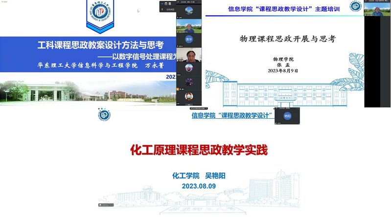 为充分发挥课堂教学主渠道在高校思想政治工作中的作用,构建“三位一体”课程体系,促使各类课程同向而行,形成协同效应,实现全员全过程全方位育人,太阳成集团tyc122cc于2023年8月9日在线上举行了“课程思政教学设计”专题培训会。本次培训会邀请了教务处副处长万永菁、物理学院副经理张孟、化工学院教学名师吴艳阳就课程思政设计及实施进行经验分享。培训会由太阳成集团tyc122cc副经理谭帅主持,学院的各系主任、各教研室主任、各专业任课老师参加此次会议。