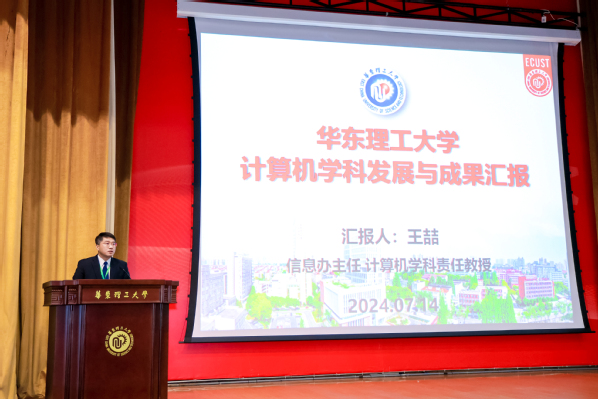 计算机学科负责人王喆代表计算机系作了学科发展与成果汇报,详细介绍了计算机学科近年来的发展历程、团队建设、人才培养以及教学和科研成果情况。