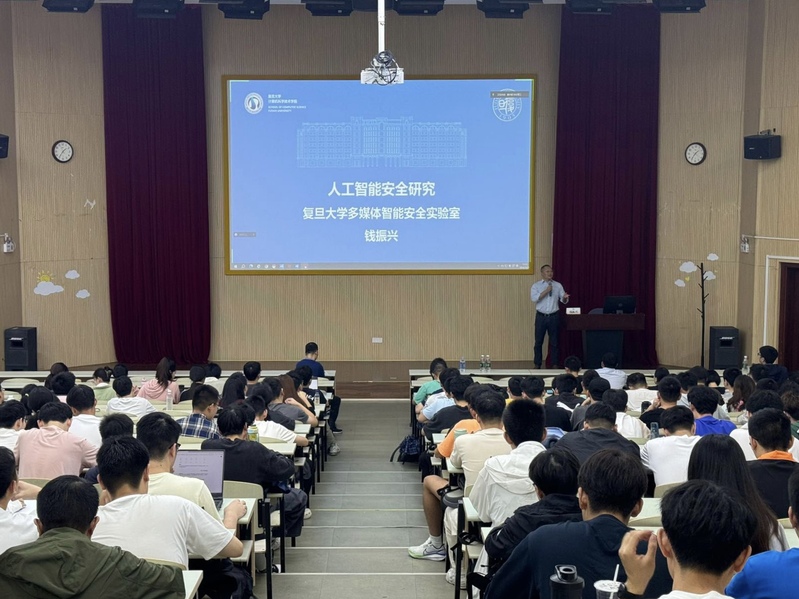 在交流环节,同学们踊跃提问:“是否有应用能够预防不法分子窃取隐私信息进行诈骗?”“如何看待人工智能生成数据的应用?”“人工智能是否会出现不可控的情况?”……钱教授针对同学们的提问一一进行了解答。