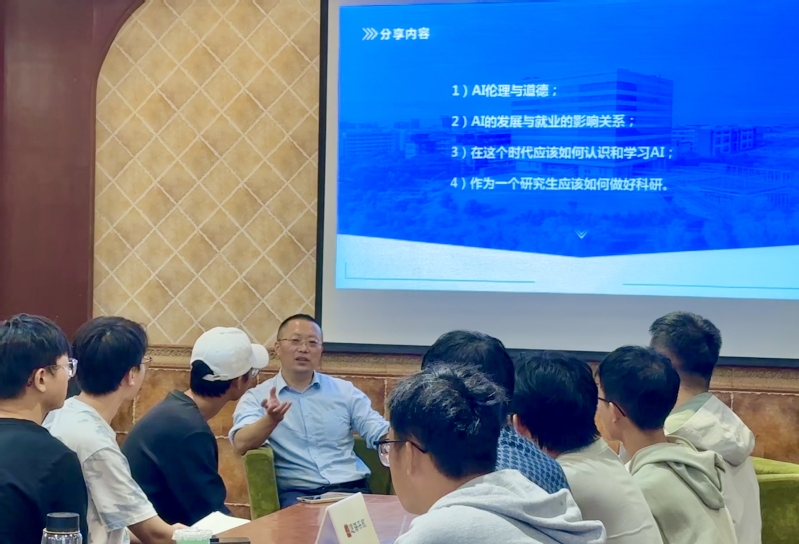钱振兴教授分别围绕“AI伦理与道德”“AI的发展与就业的影响关系”“在这个时代应该如何认识和学习AI”以及“作为一个研究生应该如何做好科研”等话题做出分享。钱教授提到,AI技术无论何时都应以人为主体,同学们要从基础理论出发,从具体实践下手,了解、理解并运用人工智能使用这项工具,以提高自己的效率和竞争力。