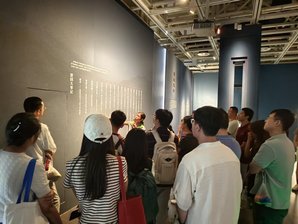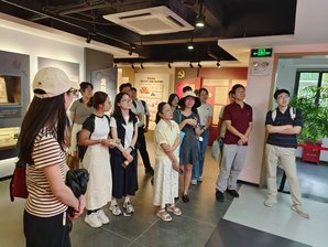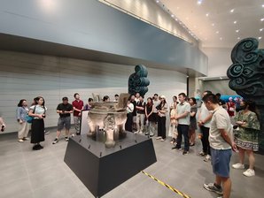 随后,大家来到上海市爱国主义教育基地和全国科普教育基地——闵行博物馆参观。在讲解员的带领下,参观了《楚风烈——安徽楚文化文物精品展》。该文物展汇集了安徽地区出土的青铜器、玉器等楚国晚期文物精品129件(套),以及鄂君启车节、错金铭文铜器、越王者旨于赐剑、附盖三足羊形铜尊等重点文物,通过沉浸式展陈设计,引领大家穿越千年时光,近距离领略楚国历史、器物文化与音乐成就,感受楚文化的独特魅力。